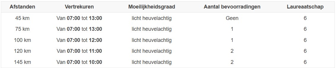 Alle 5 afstanden: 45, 75, 100, 120 en 145 km zijn volledig bewegwijzerd.